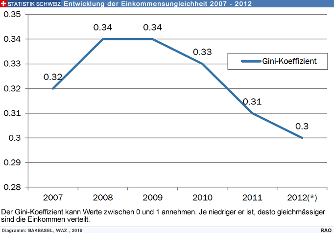 Im Jahr 2012 waren die Einkommen in der Schweiz gleicher verteilt als im Jahr 2007. Dies zeigt die Schätzung der BAK-WWZ-Einkommensverteilung. Nach einem leichten Anstieg von 2007 auf 2008 sank der Gini-Koeffizient zwischen 2009 und 2012 von 0.34 auf 0.30. Ursache für den Rückgang war ein schwächerer Anstieg der höchsten Einkommen sowie eine Verbesserung am unteren Ende des Einkommensspektrums. Seit 2014 untersucht BAK-BASEL in Zusammenarbeit mit dem WWZ der Universität Basel Fragen zur Einkommensverteilung in der Schweiz und publiziert die Resultate neu laufend unter www.verteilungsmonitor.ch.