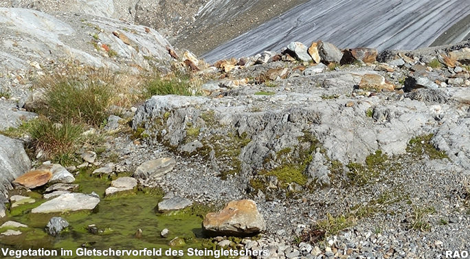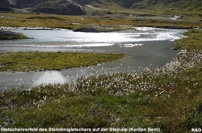 In den Gletschervorfeldern haben sich alpine Auen und Moore entwickelt. Auf Flächen wie die Uferpartien von Bergbächen, welche besonders stark von Veränderungen betroffen sind, konnten sich nur sehr widerstandsfähige und genügsame Pflanzen festsetzen. Das Wachstum dieser Pflanzen wird von extremen Lebensbedingungen beeinflusst, welche von Überflutungen, Überdeckungen mit Sedimentmaterial, intensiver Geschiebetransport und von der Wirkung von Erosioskräftenn bestimmt werden.