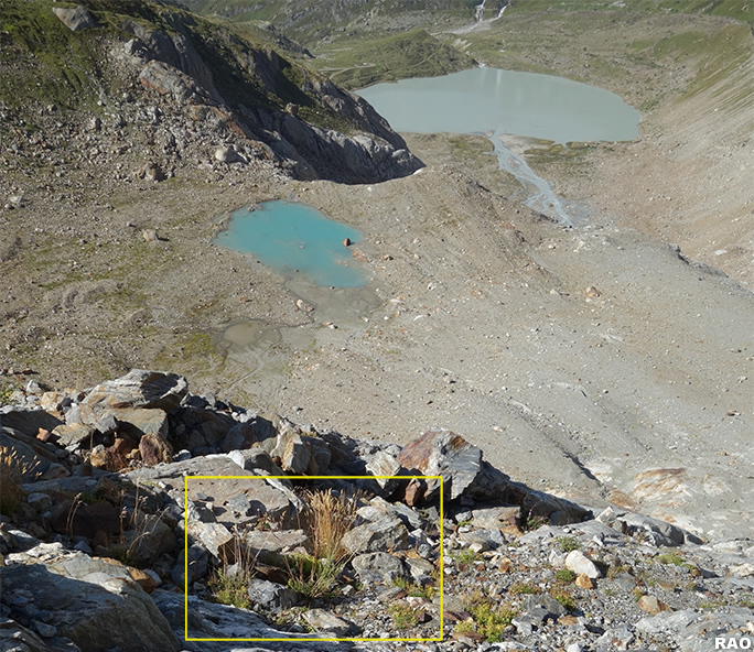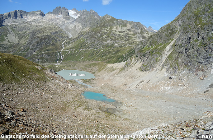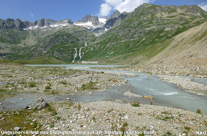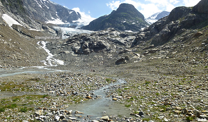 Eine Bildfolge aus der oberen Steinalp zeigt, die sich innerhalb von 15 Jahren verändernde Landschaft. Zwei grössere Feldblöcke im Sander des Steingletschers blieben allerdings innerhalb der beobachteten Zeitspanne praktisch unverändert im Flussbett liegen. Während sich das Umfeld um die beiden Blöcke herum stark verändert hat, vermochten die vorbei fliessenden Wassermassen innerhalb von eineinhalb Jahrzehnten den gelb eingerahmten Felsblock (siehe Bilder) und auch den an der linken Seite eines kleinen Hügels liegenden Block nicht sichtbar zu verschieben.