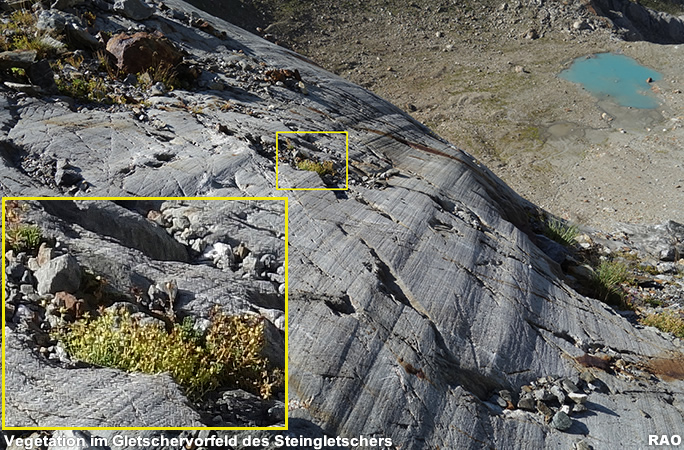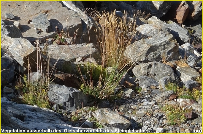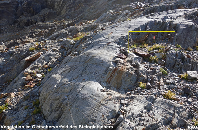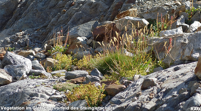 Zu den Glazialfächen im Gletschervorfeld gehören Moränenschutt- und Felsflächen im Bereich der Grundmoränen sowie an den meist steilen Hängen auf beiden Talseiten. Die noch nicht sehr lange eisfreien Flächen scheinen vegetationlos. Auf den stark den Erosionskräften ausgesetzten Schutt- und Felsflächen wird allerdings langsam, aber stetig von Pionierpflanzen besiedelt. Auf stabileren Flächen vermag sich mit einsetzender Bodenbildung eine dünne und verletzliche Vegetationsdecke zu bilden. Neben den Pionierpflanzen wachsen mit der Zeit auch Arten aus Pflanzengesellschaften, die ausserhalb der Gletschervorfelder gedeihen.