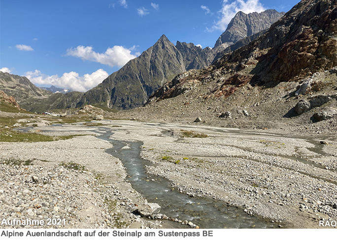 Die alpine Auenlandschaft auf der Steinalp ist wie alle anderen Auengebiete einem ständigen Wandel unterworfen. Je nach Wasserstand in den sie durchfliessenden Gewässern verschieben sich mehr oder weniger Geschiebe und Feinmaterial talwärts. Bei tiefem Wasserstand halten sich Erosion und Akkumulation in etwa die Waage. Material, welche abgetragen wurde, wird weiter unter wieder abgelagert. Die mäandrierenden Wasserläufe im Auengebiet verändern sich daher ständig.