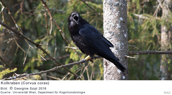 Wenn Kolkraben (Corvus corax) an einer Futterstelle auf Probleme stossen, äussern sie spezielle Futter-assoziierte Laute, um Angehörige derselben Art zu Hilfe zu rufen. Laut einer Studie von WissenschaftlerInnen der Universität Wien und der Universität Cambridge beinhalten diese Rufe Hinweise über das Alter und Geschlecht des rufenden Raben. Das fanden die VerhaltensbiologInnen mit Hilfe der Analyse von Frequenz, Rufdauer und Lautstärke der Laute heraus. Die Ergebnisse dazu erscheinen aktuell im Fachjournal "Frontiers in Zoology".