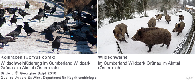 Im Rahmen der aktuellen Studie hat das internationale Forschungsteam eine freilebende Population von Raben beobachtet, die regelmässig bei der Wildschweinfütterung im Cumberland Wildpark Grünau im Almtal (Österreich) anwesend ist.