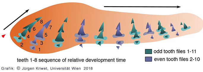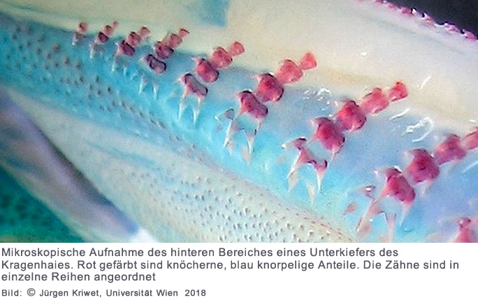 Eine neue Studie, an der auch Jürgen Kriwet vom Institut für Paläontologie der Universität Wien beteiligt war, zeigt, dass das alternierende Muster der Zahnerneuerung ursprünglich für Knorpelfische gilt. "Wir vermuten, dass dies möglicherweise auch das ursprüngliche Muster der Zahnerneuerung für kiefertragende Wirbeltiere insgesamt war", meint Kriwet. Die spezielle Anordnung der Zähne in eine einzige, schneidende Zahnserie entlang der Kieferränder entstand im Lauf der Evolution von Haien durch Modifizierung eines ursprünglichen alternierenden Zahnersatzmusters. Dabei werden Zähne entsprechend eines spezifischen Bildungsmusters reguliert, um gleichzeitig und räumlich gleichmässig ersetzt zu werden und so eine einzige, durchgängige Zahnserie zum Zubeissen zu bilden. Bei anderen Haien mit ähnlichen Schneidegebissen, wie dem Mako- oder dem Weissen Hai, wird dagegen die Ausbildung einer kontinuierlichen Reihe von funktionellen Zähnen entlang der Kieferränder nicht durch zeitliche Plastizität der Zahnbildung, sondern durch den Verlust einzelner Zahnreihen im Laufe ihrer Evolution erreicht.