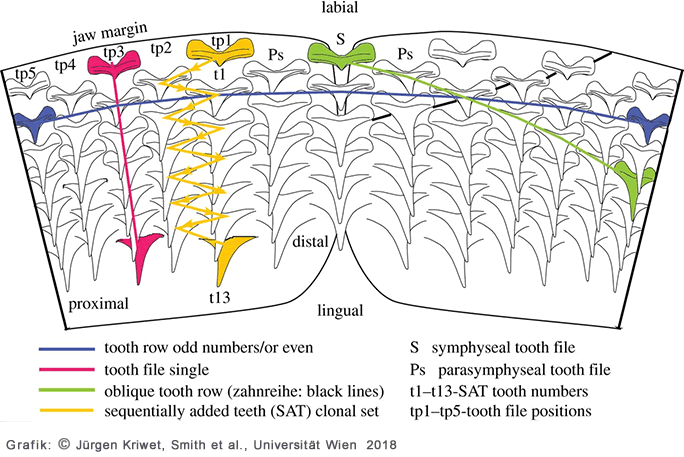 "Um die Entwicklung der Zahnerneuerung in einem evolutiven Kontext zu verstehen, ist es daher wichtig, Knorpelfische, zu denen die heutigen Haie und Rochen gehören, als Modellorganismen heranzuziehen", so Kriwet. Bei ihnen nehmen ForscherInnen an, dass sie ursprüngliche Merkmalsausprägungen und Entwicklungsmechanismen bewahrt haben. So haben sie z.B. die Möglichkeit einer ständigen Zahnerneuerung von ihren frühesten Verwandten geerbt. Die Zähne heutiger Haie sind hintereinander auf den Kiefern angeordnet und ihr Ersatz erfolgt fliessbandartig, so dass ältere, funktionelle Zähne am Kieferrand stehen, während neue Zähne tief innen an den Kiefern gebildet werden. Regelmässig angeordnete funktionelle Zähne bilden ein effektives Schneidegebiss, in dem die Zähne oftmals eng miteinander in Verbindung stehen und so eine klingenartige Schneidekante formen. Eine solche Bezahnung, die aus nur einer einzelnen Serie funktioneller Zähne am Kieferrand besteht, stellt eine besondere Anpassung an eine schneidende Ernährungsweise dar.