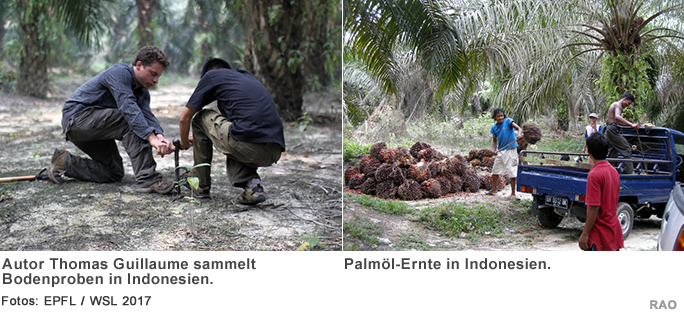 Thomas Guillaume, Postdoktorand im Labor für Ökosysteme (ECOS) der EPFL und an der Eidgenössischen Forschungsanstalt für Wald, Schnee und Landschaft WSL, ist der Erstautor einer Übersichtsstudie zu den Umweltauswirkungen des Anbaus von Ölpalmen in Indonesien. Der am 19. Juni 2017 im Fachjournal Nature Communications erschienene Artikel befasst sich speziell mit den Kohlenstoffemissionen, die beider Umwandlung von Tropenwäldern in Monokulturen für die Palmölerzeugung entstehen. Grundlage war eine über zwei Jahre gesammelte Datenreihe der Universität Göttingen über die Böden und die Vegetation im Zentrum von Sumatra. Damit konnte Guillaume die Auswirkung des intensiven Anbaus von Ölpalmen in Monokulturen in Wäldern mit jenem von Kautschukbäumen vergleichen, die auf weniger intensive Weise angebaut werden.