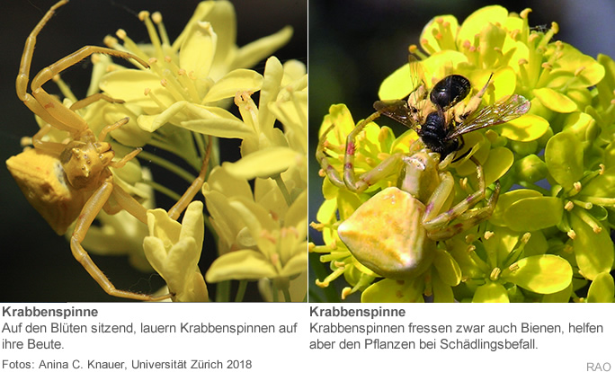 Krabbenspinnen sind Jäger, die auf den Blüten der Pflanze ihrer Beute auflauern. Bisher ging man davon aus, dass solche Spinnen den Pflanzen schaden, da sie bestäubende Insekten fangen oder vom Blütenbesuch abhalten. Die UZH-Ökologen zeigen nun einen überraschenden Effekt: «Krabbenspinnen orientieren sich am Blütenduft, um die Pflanzen zu finden. Dazu verwenden sie β-Ocimen - dieselbe Duftsubstanz, die auch Bienen zu den Blüten lockt», sagt Schiestl.