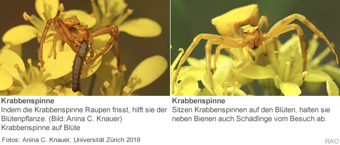 Sitzen Krabbenspinnen auf den Blüten, kommen tatsächlich weniger Bienen, da sie von den Spinnen vom Blütenbesuch abgehalten werden. Doch die Spinnen fressen nicht nur Bestäuber. Sie eliminieren auch pflanzenfressende Insekten oder deren Raupen, die sich von Blüten oder Früchten ernähren, und den Pflanzen schaden. Die Krabbenspinnen nützen so den Pflanzen - ganz nach dem Prinzip «der Feind meines Feindes ist mein Freund». Dieser Nutzen ist offenbar so gross, dass die Pflanzen nach einem Befall mit Frassinsekten den Duftstoff, der die Spinnen anlockt, in grösserer Menge abgeben. Dieser «Hilferuf» zeigt Wirkung: Die Spinnen besuchen daraufhin besonders oft die befallenen Blüten, wo sie reiche Beute vorfinden.