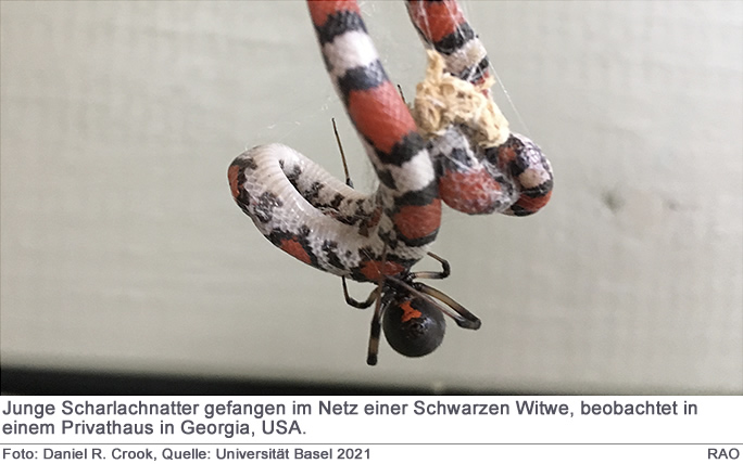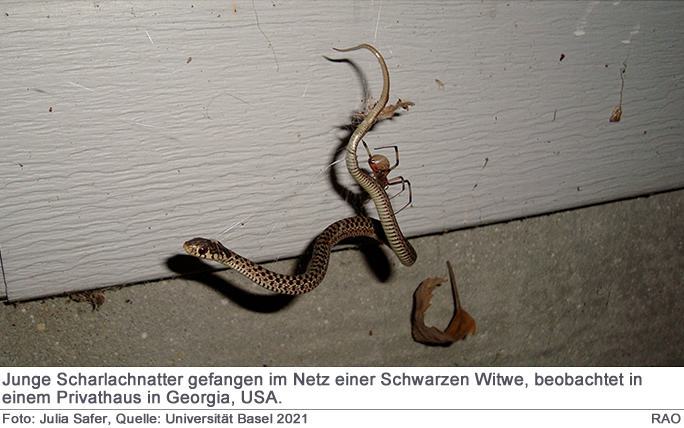 Spinnen sind zur Hauptsache Insektenfresser, sie erweitern ihren Speiseplan aber, indem sie gelegentlich kleine Schlangen fangen und fressen. PD Dr. Martin Nyffeler, Spinnenforscher an der Universiät Basel, und der amerikanische Schlangenforscher Prof. Dr. Whitfield Gibbons von der University of Georgia, USA, sind diesem Phänomen im Rahmen einer sogenannten Meta-Analyse auf den Grund gegangen. Ihre Erkenntnisse aus der Untersuchung von 319 Vorfällen dieses aussergewöhnlichen Fressverhaltens sind jüngst im «Journal of Arachnology» erschienen.