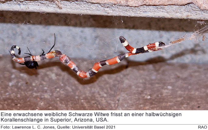 Eine weitere neue Erkenntnis aus der Meta-Analyse: Spinnen können Schlangen aus sieben verschiedenen Familien überwältigen. Sie sind in der Lage, Schlangen zu bezwingen, die 10- bis 30-mal grösser sind als sie selber.