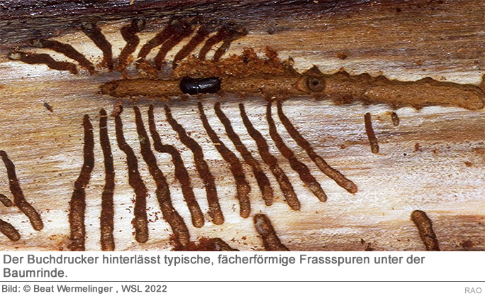 Daten aus dem Buchdrucker-Simulationsmodell zeigen, dass die überwinternden Buchdrucker aufgrund des ungünstigen Wetters im Frühling und Frühsommers im Vergleich zu den letzten drei Jahren teilweise etwas verspätet ausgeschwärmt sind. Allerdings lag der Flugbeginn ungefähr im Mittel der vergangen 10 Jahre (https://www.borkenkaefer.ch/index_DE). In den wenigen und oft relativ kurzen Zeitfenstern mit günstigen Flugbedingungen konnten die Käfer allerdings in grossen Massen ausfliegen. Dies wurde beispielsweise an einigen Standorten im Wallis beobachtet, an welchen in wenigen und relativ engen Zeitfenstern ein massiver Ausflug der überwinternden Buchdruckergeneration festgestellt wurde. Diese hat innerhalb kurzer Zeit zahlreiche kleine Streuschäden verursacht und zu der durch den Kanton gemeldeten Verdoppelung des Sommerzwangsnutzungsvolumen im Vergleich zum Vorjahr beigetragen.