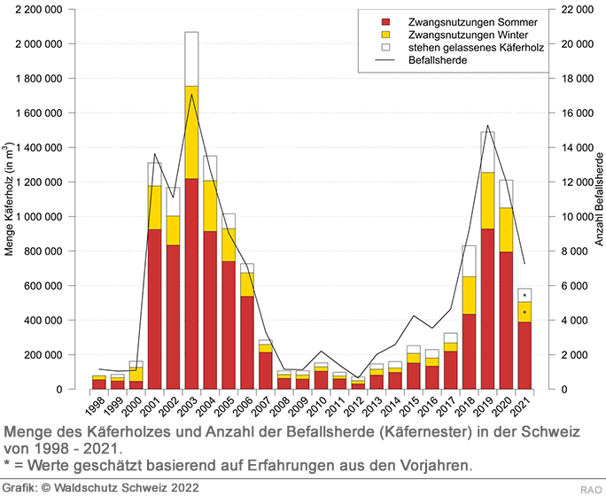 Die für das Jahr 2020 ursprünglich prognostizierte Käferholzmenge von 1.5 Millionen m3, welche sich aus den reell erhoben Sommerzwangsnutzungen 2020 sowie empirischen Schätzungen der Winterzwangsnutzungen (2020/21) und des stehen gelassenen Käferholzes (2020) zusammensetzt, wurde erfreulicherweise nicht erreicht und betrug total etwas mehr als 1.2 Mio. Kubikmeter (Stroheker et al. 2020, Abb. 1, Tab. 1).