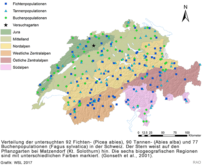Um dieses Risiko zu untersuchen, haben Forschende der WSL zwei Pflanzgärten bei der WSL in Birmensdorf (Zürich) und oberhalb Matzendorf (Solothurn) angelegt. An rund 16'000 Pflanzen haben sie untersucht, welche Wachstumseigenschaften die Nachkommen von 92 Fichten- sowie 90 Tannen- und 77 Buchen-Populationen aus allen Regionen der Schweiz aufweisen. Die Populationen stammen aus unterschiedlich warmen und feuchten Klimaregionen der ganzen Schweiz. Konkret untersuchten die Forschenden das Wachstum der jungen Bäume, den Austriebszeitpunkt der Blattknospen im Frühling sowie den Wachstumsstopp im Spätsommer (Fichte und Tanne) bzw. die Blattverfärbung im Herbst (Buche). Zeigten die Populationen grosse Unterschiede in diesen wichtigen Merkmalen und hingen diese mit dem Klima am Herkunftsort zusammen, bedeutet dies eine starke lokale Anpassung und damit ein hohes Risiko für die Baumart, in Zukunft durch den Klimawandel lokal nicht mehr optimal angepasst zu sein.