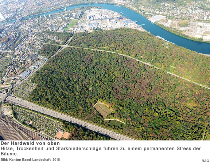 In einem Wald in Hölstein bei Basel betreibt das Departement Umweltwissenschaften der Universität Basel ein für Europa einmaliges Waldexperiment. Auf der 1,6 Hektar grossen Untersuchungsfläche wachsen insgesamt 450 Bäume, die zwischen 50 und 120 Jahre alt sind, darunter Rotbuchen, Stieleichen, Hagebuchen, Fichten, Waldföhren, Elsbeeren und andere. Ein 50 Meter hoher Kran ermöglicht es, die Auswirkungen des Klimawandels in den wichtigsten und sensibelsten Teilen der Bäume - den Baumkronen - zu erforschen. Weiter soll ab 2021 die Hälfte der Untersuchungsfläche mit einem Regendach überdeckt werden, um Trockenheit zu simulieren. Die Forschenden möchten klären, welche einheimischen Baumarten besonders empfindlich auf Trockenheit ansprechen und ob ausgewachsene Bäume in der Lage sind, ihren Stoffwechsel an Klimaveränderungen anzupassen. Zudem geht es um die Frage, wie sich der Wassermangel auf biogeochemische Kreisläufe im Wald auswirkt und ob unsere Wälder auch unter zukünftigen Klimabedingungen grosse Mengen an Kohlenstoff speichern können. Das Waldexperiment startete 2018 und hat eine Laufzeit von 20 Jahren.