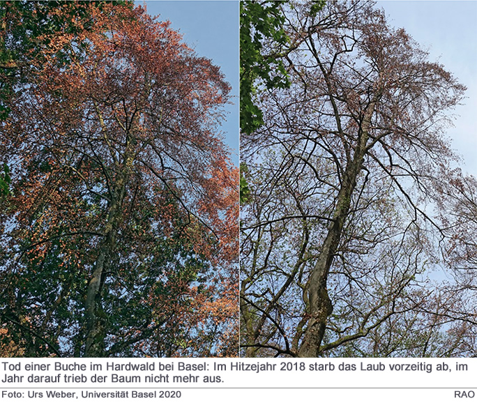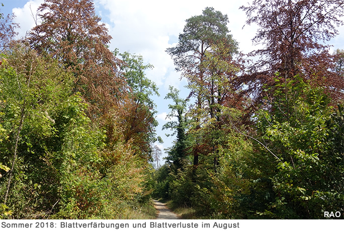 Die physiologischen Messungen am Forschungsstandort bei Basel im Hitzesommer 2018 haben gezeigt, dass negative Saugspannungen in den Geweben der Bäume und Wassermangel früher als gewöhnlich auftrat. Vor allem war dieser aber intensiver ausgeprägt als jemals zuvor flächendeckend in Deutschland, Österreich und der Schweiz beobachtet. Schon im Verlauf des Sommers traten daher bei vielen forstwirtschaftlich wichtigen Baumarten schwere dürrebedingte Stress-Symptome auf. Das Laub welkte, alterte und wurde frühzeitig abgeworfen.