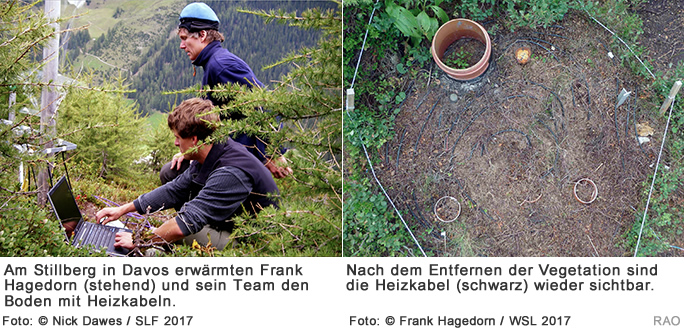 An der Waldgrenze erwärmten sie den Boden unter Lärchen- und Bergföhrenwäldern um 4°C. Dies entspricht einer Erwärmung, wie sie bis zum Jahr 2070 erwartet wird. Auf insgesamt 20 Testflächen legten sie dazu Heizkabel auf der Bodenoberfläche aus und heizten so die oberste organische Bodenschicht auf.