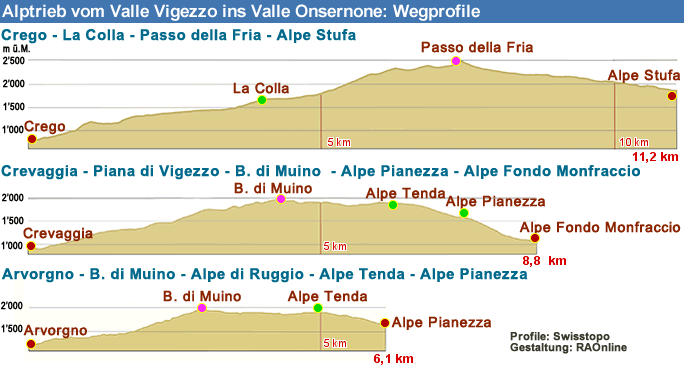 Im Frühsommer nach der Schneeschmelze treiben die Bauern im Valle Vigezzo noch heute ihr Vieh auf den seit Jahrhunderten von ihnen genutzten Pfaden über die Pässe auf die Sommerweiden im Valle Onsernone. Je nach Standort ihrer Ställe für den Winterbetrieb oder die Lage ihrer Maiensässe mussten und müssen sie bei ihren Alpaufzügen verschieden lange Wegstrecke und Höhendifferenzen überwinden. Die von den italienischen Bauern bei ihrem Viehtrieb zu bewältigenden Wege und Höhendifferenzen vom Val Vigezzo ins obere Onsernonetal sind verglichen mit anderen noch heute in der Schweiz Jahr für Jahr stattfindenden Alpaufzügen keineswegs ausserordentlich lang bzw. gross.