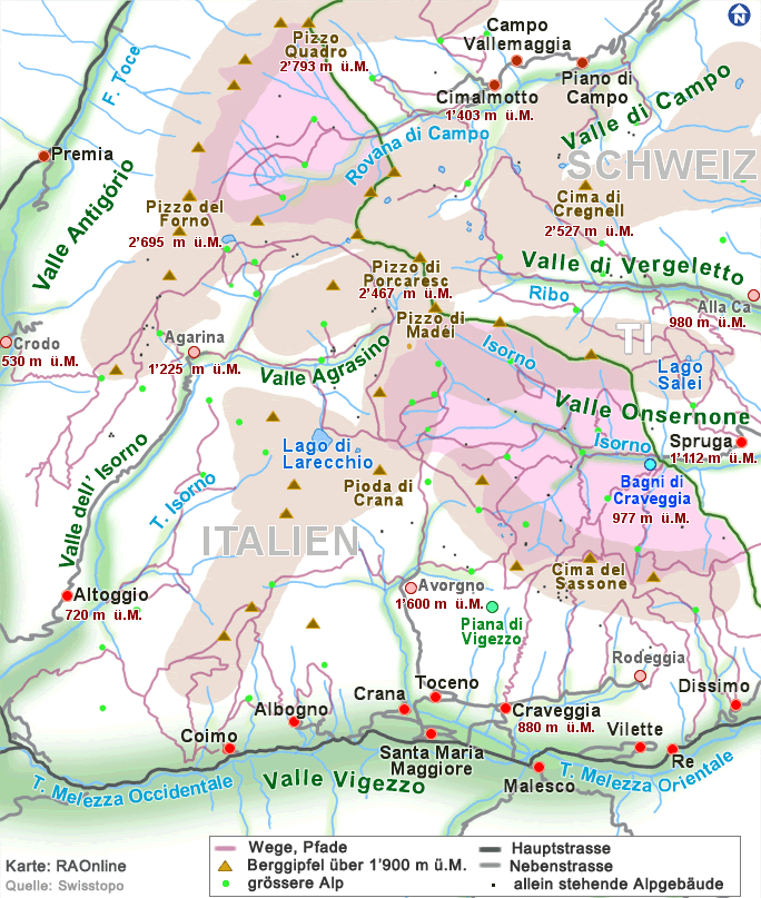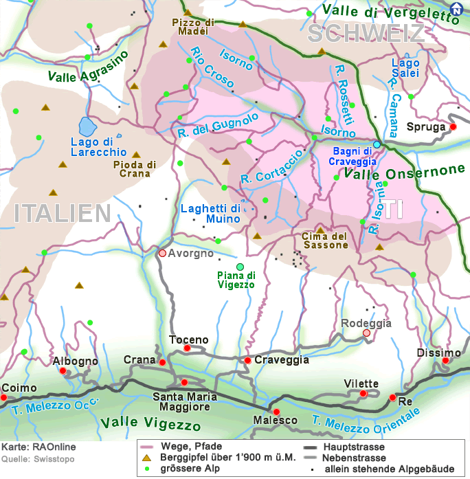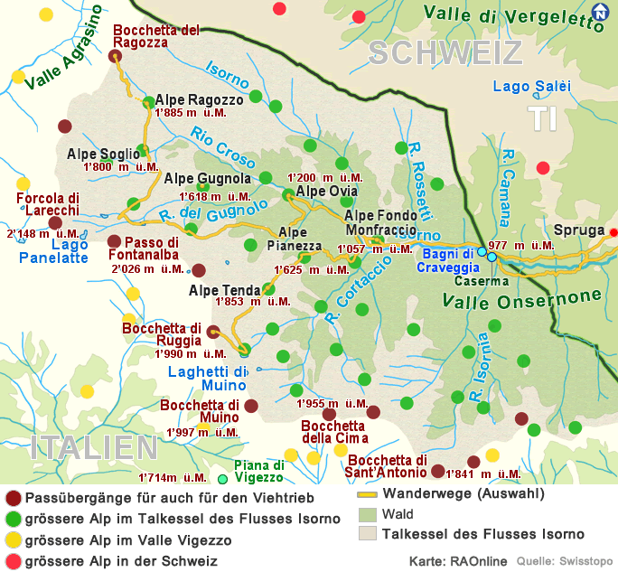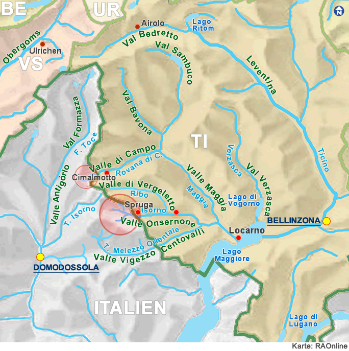 Wer vom Weiler Spruga aus auf der Fahrstrasse nach Westen in Richtung hinteres Onsernonetal, dem Quellgebiet des Flusses Isorno, wandert, trifft nach etwas mehr als einer halben Stunde Fussmarsch am Ende der Fahrstrasse auf die Grenze zu Italien. Das Gebiet weiter flussaufwärts liegt seit Beginn des 19. Jahrhunderts auf italienischem Staatsgebiet.