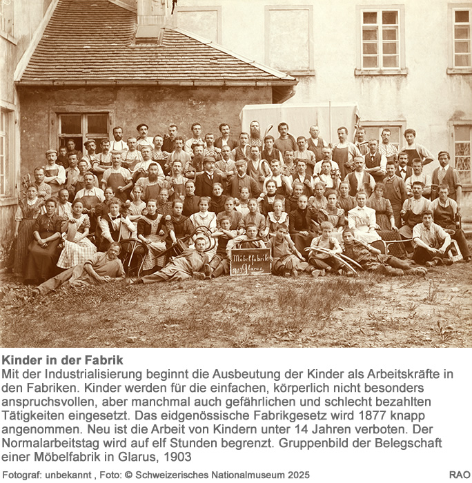 Kinderarbeit war ein fester Bestandteil des Alltags, noch bevor Fabriken die Landschaft prägten. Weil das Einkommen der Eltern nicht reichte, mussten Kinder zum Überleben der Familie beitragen und arbeiteten im Haushalt, auf dem Hof oder in der Heimarbeit mit. Während dies einerseits auch Teilhabe bedeutete, wurde die Arbeit von Kindern mit der industriellen Revolution vermehrt ausgebeutet: In stickigen Textilfabriken, beim Spulen und Weben, in der Seidenindustrie oder in den Glarner Stoffdruckereien arbeiteten selbst Sechsjährige unter gefährlichen Bedingungen - oft bis zu 16 Stunden am Tag.