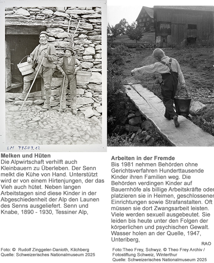 Die Ausstellung im Landesmuseum Zürich beleuchtet dieses Kapitel Schweizer Sozialgeschichte. Sie zeigt, wie Kinder in der Landwirtschaft, im Haushalt oder in Heimen mitarbeiten mussten und wie sich die gesellschaftliche Wahrnehmung von Kinderarbeit wandelte. Zugleich würdigt die Ausstellung jene, die sich für Bildung und Schutz der Kinder einsetzten. Die Einführung der Schulpflicht 1874 (siehe: Bundesverfassung 1874) war ein Meilenstein auf dem Weg zu einem neuen Verständnis von Kindheit - weg von ökonomischer Not, hin zu Bildung und Entwicklung. Und doch war der Weg lang: Noch bis weit ins 20. Jahrhundert mussten Kinder aus armen Familien in fremden Haushalten, als Kaminfeger in Italien oder als Schwabenkinder in Süddeutschland arbeiten oder wurden von den Behörden fremdplatziert.