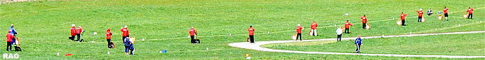 Hornusser schlägt die "Nuss" mit einem "Stecken" ins Ries (Spielfeld).