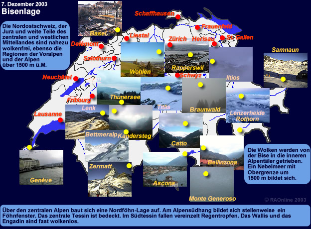 Am 7. Dezember 2003 wurde das Wetter in der Schweiz durch eine Bisenlage bestimmt. ein kräftiger, zeitweise böiger Nordostwind blies über das Schweizer Mittelland gegen die Alpen. Webcams an verschiedenen Standorten lieferten Bilder zur Wettersituation.