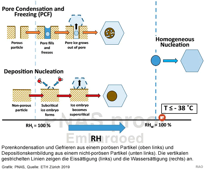 In einem sogenannten Nukleationsprozess bildet sich Eis auf Staubpartikeln und anderen Materialien in der Atmosphäre. Partikel mit Poren – eine Art Mini-Schwämme – sind dabei sehr viel effizienter im Bilden von Eispartikeln sind als Partikel ohne Poren. So kam das Forscherteam zum Schluss, dass Wasserdampf in den winzigen Poren kondensieren kann und dass die Eiskristalle aus flüssigem Wasser entstehen – nicht aus Dampf.