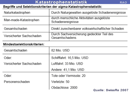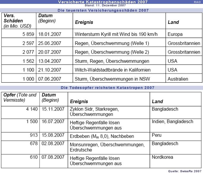 Swiss Re-sigma-Bilanz zu Katastrophen in 2007 |