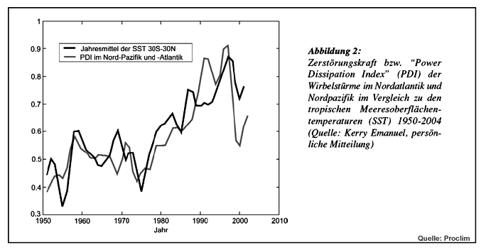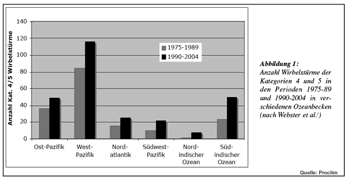 Die meisten Klimamodelle prognostizieren eine Zunahme der maximalen Windgeschwindigkeiten in Wirbelstürmen aufgrund der globalen Erwärmung. Bei der erwarteten Erwärmung im 21. Jahrhundert beträgt die Zunahme einige Prozent. Bezüglich der Häufigkeit wird global keine änderung oder eine Abnahme errechnet, allerdings mit Ausnahme des Atlantiks, wo mit einer Zunahme gerechnet werden muss. Die Modelle, die für diese Untersuchungen verwendet werden, haben jedoch eine relativ grobe Auflösung, d.h. sie berechnen die Atmosphärenwerte nur alle ca. 100 km. Damit können Wirbelstürme mit einer Kernzone der höchsten Windgeschwindigkeiten von weniger als 100 km Ausdehnung nur relativ grob erfasst werden. Die Resultate sind also mit starken Unsicherheiten behaftet. Vor kurzem hat jedoch eine japanische Studie mit einem feineren Modell mit 20 km Auflösung die bisherigen Resultate bestätigt, nämlich eine Zunahme der Intensität und eine Abnahme der Häufigkeit mit Ausnahme des Atlantiks. Die in jüngsten Studien beobachtete Zunahme der Intensität von Wirbelstürmen in den letzten Jahrzehnten ist allerdings bedeutend grösser als dies die Modelle für das ganze 21. Jahrhundert berechnen. Da stellt sich die Frage, ob die Modelle den Einfluss der globalen Erwärmung unterschätzen oder ob die beobachtete Zunahme noch andere Gründe hat. Klarer Zusammenhang mit Ozeantemperaturen Kürzliche Forschungsarbeiten haben die weltweiten Wirbelstürme in der ersten und der zweiten Hälfte der letzten rund 40 Jahre verglichen. Dabei wurde eine Zunahme der Anzahl Stürme der Kategorien 4 und 5 (siehe Abbildung 1) um etwa 60%1 und eine Zunahme der Zerstörungskraft der Wirbelstürme um 40-50% festgestellt2 (siehe Abbildung 2). Die Zerstörungskraft bzw. "Leistung » eines Wirbelsturmes ist proportional zum Kubik der Windgeschwindigkeit. Eine Zunahme der maximalen Windgeschwindigkeit um 10% erhöht also die Zerstörungskraft um einen Drittel. Es konnte zusätzlich gezeigt werden, dass diese Zunahme der Wirbelsturmstärke parallel zum Anstieg der Meeresoberflächentemperaturen verläuft und dies der einzige Faktor ist, welcher die wachsende Sturmintensität erklären kann. Ein