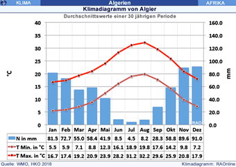 Der äusserste Norden von Afrika (Bsp. Algier in Algerien) gehört zum subtropischen Winterregenklima (Mittelmeerklima) mit hohen Sommertemperaturen.