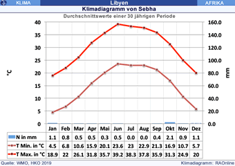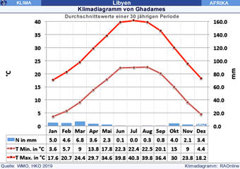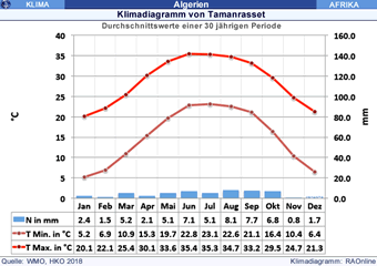 Tamanrasset in Algerien sowie Ghadames und Sebha in Libyen haben ein ausgeprägtes kontinentals Klima der subtropischen Wüsten (grosse Temperaturunterschiede zwischen Sommer und Winter, extrem heisse Sommer und grosse Trockenheit).