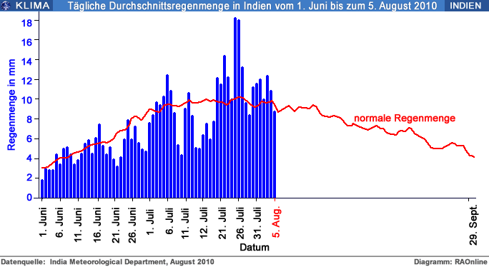 Heftige Monsunniederschläge im August 2010 haben in Pakistan über 1500 Tote und in Indien über 115 Menschenleben gefordert. Beide Wetterereignisse sind in ihrer Art sehr selten. Lokale Wolkenbrüche über dem östlichen Himalaja haben die Flüsse zum überlaufen gebracht. Betrachtet man den diesjährigen Niederschlagsverlauf (siehe Grafik), so wird das Monsunjahr 2010 in Indien eher als ein Jahr mit unterdurchschnittlichen Regenmengen in die Statistiken eingehen. Die Wetterbehörden in Nepal meldeten für die erste Augustwoche 2010 nur ein Drittel der sonst üblichen Regenmenge.