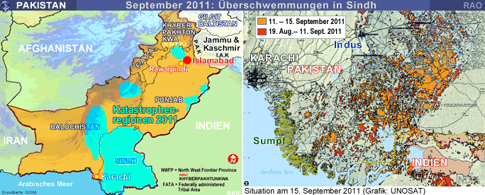 In Pakistan waren im September 2011 mindestens 5,44 Mio Menschen von den Überschwemmungen betroffen. Rund 1,8 Mio Menschen mussten ihre Wohnungen verlassen. Über 2,8 Mio Menschen benötigten dringend Lebensmittelhilfe. Über 6'000 vorübergende Notunterkunfte wurden in 14 Distrikten der Provinz Sindh eingerichtet. Bis am 12. September 2011 wurden rund 200 Todesfälle im Zusammanhang mit den Fluten gemeldet. 22 der 23 Distrikten in der Provinz Sindh und Teile von Balochistan wurden teilweise überflutet.