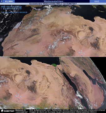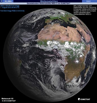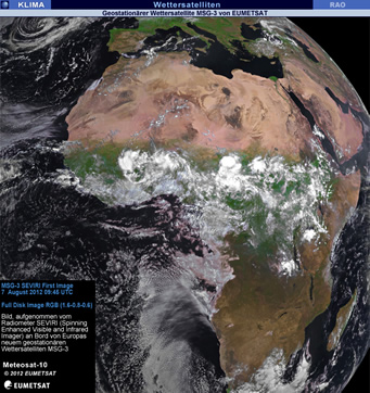 Am 7. August 2012 hat das abbildende Radiometer SEVIRI (Spinning Enhanced Visible and Infrared Imager) an Bord von Europas neuem geostationären Wettersatelliten MSG-3 das erste Bild der Erde eingefangen. Dies zeigt, dass der am 5. Juli gestartete Satellit voll funktionsfähig und auf dem besten Wege ist, sechs Monate nach Inbetriebnahme den operativen Dienst zu übernehmen. Verantwortlich für den anfänglichen Betrieb nach dem Start (der so genannten Start- und frühen Umlaufphase - LEOP) des MSG-3 war die Europäische Weltraumorganisation (ESA), die den Satelliten am 16. Juli an EUMETSAT übergeben hat. Das erste Bild ist das Ergebnis gemeinsamer Anstrengungen von ESA, EUMETSAT und der europäischen Raumfahrtindustrie. Bei den Pflichtprogrammen greift EUMETSAT zur Entwicklung neuer Satelliten und Beschaffung wiederkehrender Satelliten wie MSG-3 auf die Unterstützung der ESA zurück. Dank dieses Kooperationsmodells, das die optimale Nutzung des jeweiligen Know-hows beider Agenturen ermöglicht, ist Europa bei der Satellitenmeteorologie weltweit führend.