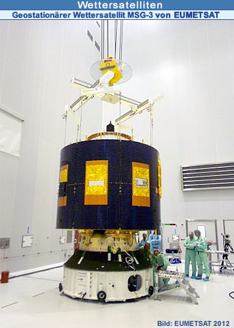 5. Juli 2012 Die europäische Wettersatellitenorganisation EUMETSAT hat gestern Nacht erfolgreich den dritten Wettersatelliten der zweiten Generation (MSG-3) ins All geschickt. Dieser Start wird die Kontinuität der Erdbeobachtungen durch die Serie der geostationären Meteosat-Satelliten sichern und damit weiterhin einen wesentlichen Beitrag zu Wettervorhersagen, zur Beobachtung des Klimawandels und zur Sicherheit von Leben und Infrastruktur bei Extremwetterlagen beitragen. Am 5. Juli 2012 erfolgte der Start der Ariane Trägerrakete vom Weltraumbahnhof Kourou in Französisch-Guayana. Mit an Bord war der Wettersatellit MSG-3, der nun in eine geostationäre Umlaufbahn auf 36'000 km über dem Äquator gebracht und im Anschluss an seine Positionierung justiert und ausführlich getestet wird. Die ersten Daten werden ca. ab Oktober 2012 verfügbar sein. Ab Januar 2013 soll MSG-3 unter dem Namen Meteosat-10 den vollständigen Betrieb aufnehmen.