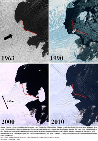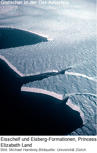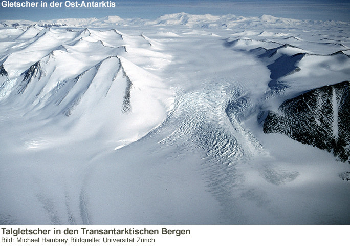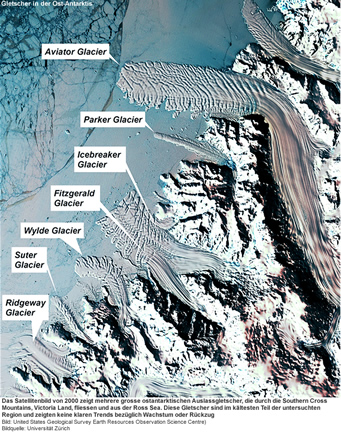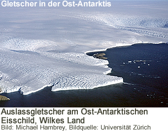 Der Ost-Antarktische Eisschild scheint durch die Klimaerwärmung mehr gefährdet zu sein als bisher angenommen. Ein internationales Forschungsteam der Universitäten Durham und Zürich hat zum ersten Mal die langzeitliche Entwicklung von Auslassgletschern mittels Satellitenbildern untersucht. Dabei zeigte sich, dass Vorstoss und Rückzug der 175 untersuchten Gletscher eng mit den Klimaveränderungen zusammenhängen.