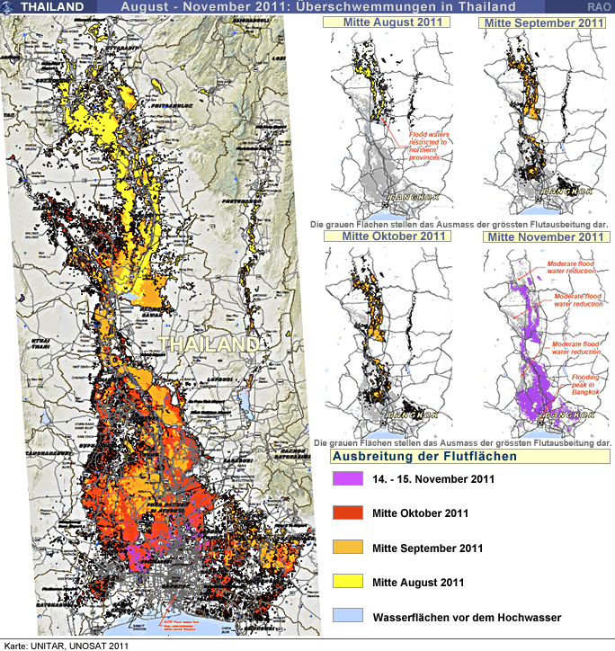 Das katastrophale Hochwasserereignis in Thailand nahm im August 2012in den nördlichen Provinzen seinen Anfang. Im Oktober 2012 erreichte die Flut die Aussenbezirke von Bangkok. Bangkok wurde durch das Hochwasser allmählich eingeschlossen. Mitte November 2012 wurde Innenstadt von Bangkok überflutet. Um Bangkok herum waren nahezu alle landwirtschaftlich genutzten Flächen, viele wichtige Hauptverbindungsstrassen von Bangkok in die übrigen Landesteile und weite Teile des Siedlungsgebietes überflutet.