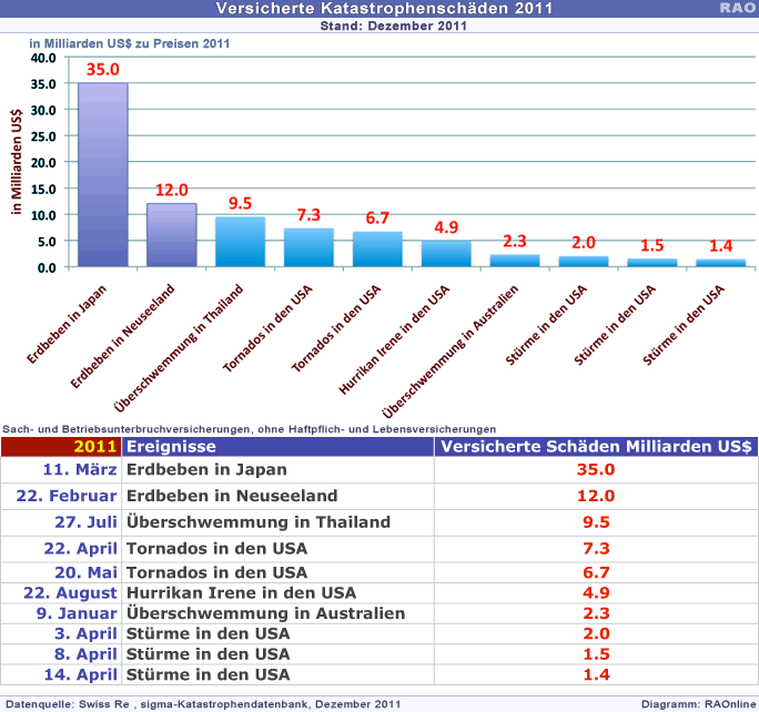Mit rund 108 Mrd. USD versicherten Katastrophenschäden ist 2011 gemäss den sigma-Aufzeichnungen nach 2005 (123 Mrd. USD) das zweitteuerste Jahr für die Versicherungsbranche. Dank moderaten Hurrikanschäden blieben die Kosten hinter denjenigen von 2005 weltweiten Lieferketten einbezogen werden. Zum Vergleich: Das Beben in Neuseeland im Februar verursachte wirtschaftliche Schäden von 15 Mrd. USD. Dank der hohen Erdbebenversicherungs-Durchdringung, insbesondere im Bereich der Wohnimmobilien, wird die Versicherungswirtschaft aber den grössten Teil dieser Schäden bezahlen.