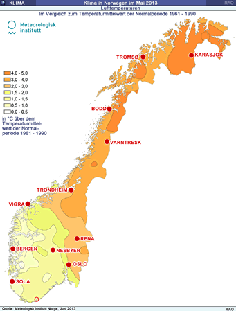 Während die Frühlingsmonate 2013 in Mitteleuropa zu kühl und zu nass warten, war es im Norden von Norwegen deutlich zu warm und zu trocken. Vor allem nördlich des Polarkreises wurden im Frühling 2013 ungewöhnlich hohe Temperaturen gemessen.