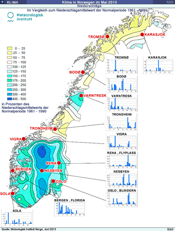 Bei den Niederschläge war Norwegen im Mai 2013 ein geteiltes Land. Während es im Süden des Landes mehr als normal regnete, fielen die Niederschläge in den übrigen zwei Dritteln des Landes geringer aus.