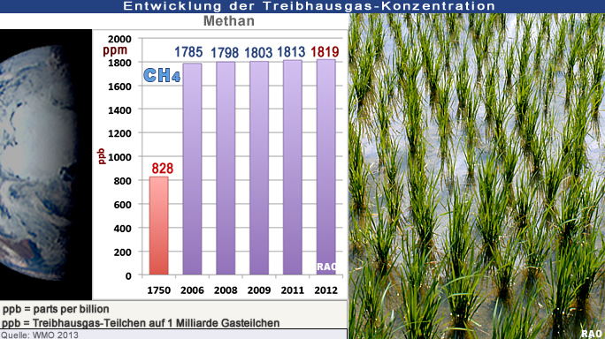 2011 erreichte die Methan-Konzentration in der Atmosphäre mit 1'813 ppb (parts per billion oder ein Teilchen auf 1 Milliarde anderer Gasteilchen) einen neuen Höchstwert oder 119% mehr als 1750, vor der vorindustriellen Periode.
