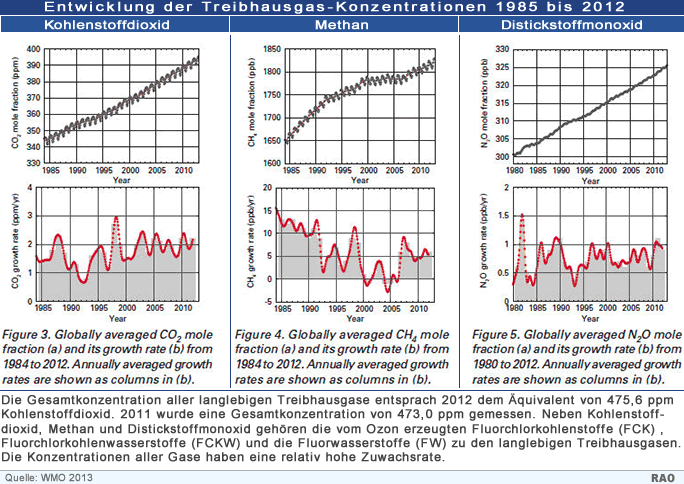 Das Treibhausgas Kohlenstoffdioxid erreichte 2012 eine durchschnittliche Konzentration von 393,1 ppm (parts per million), Methan 1'819 ppb (parts per billion) und Distockstoffmonoxid 325,1 ppb . Die Gsamtkonzentration aller Treibhausgase erreichte 2012 den Wert 475,6 ppm. 2011 waren es noch 473,0 ppm.