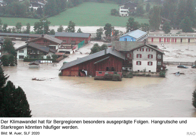 Der globale Klimawandel schreitet voran - darin sind sich führende Wissenschafterinnen und Wissenschafter weltweit einig. Dies beeinflusst Wetterextreme und Naturereignisse im Alpenraum besonders stark, denn hier fällt die Erwärmung doppelt so hoch aus wie im globalen Durchschnitt. Die Folgen können Überschwemmungen, Murgänge und Hangrutsche sowie lange Trockenheitsperioden im Sommer sein. Solche Ereignisse können soziale und wirtschaftliche Folgen haben, wie etwa der Bergsturz und die anschliessenden Murgänge in Bondo im Bergell gezeigt haben.