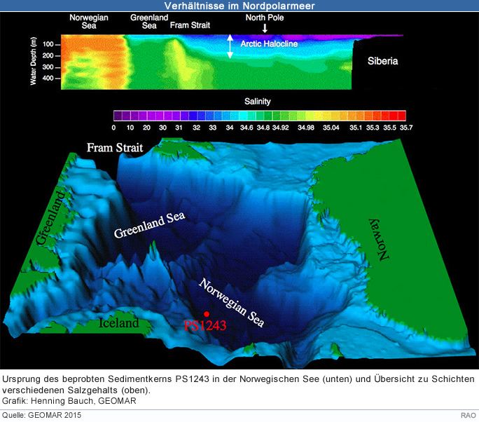 Eine Linse aus kaltem, süssem Schmelzwasser an der Oberfläche kann den Kontakt wie eine natürliche Barriere verhindert haben. "Dies ist gut vergleichbar mit der heutigen Situation im Arktischen Ozean", so Dr. Bauch. "Allerdings gibt es dort heute nicht mehr so viele grosse Eisberge, und diese Wasserschicht ist nur etwa 200 Meter mächtig.