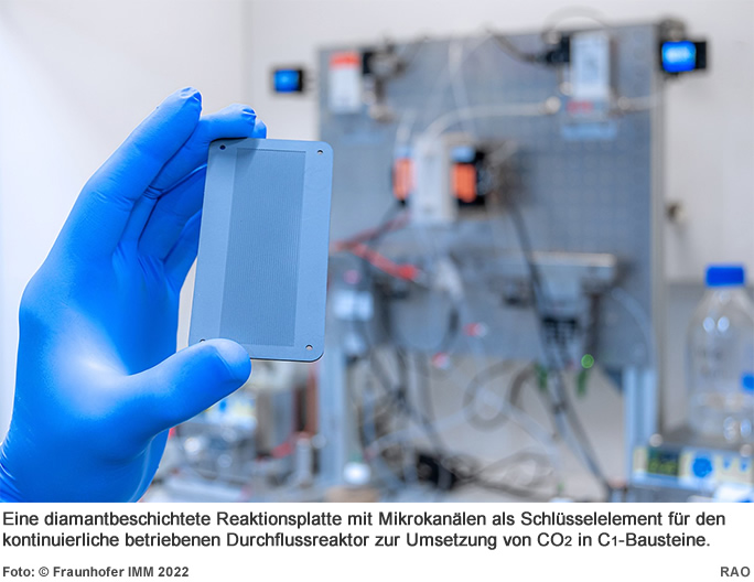 Eine diamantbeschichtete Reaktionsplatte mit Mikrokanälen als Schlüsselelement für den kontinuierliche betriebenen Durchflussreaktor zur Umsetzung von CO2 in C1-Bausteine.