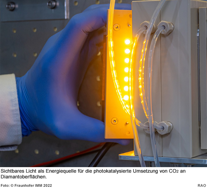 Auf Laborebene wurde die Umsetzung von CO2 bereits eingehend untersucht, Nanodiamanten dienten dabei als umweltfreundlicher Photokatalysator. Gemeinsam mit Partnern überführen Forschende des Fraunhofer-Instituts für Mikrotechnik und Mikrosysteme IMM diese Reaktion nun in einen kontinuierlichen Prozess - und bringen das Verfahren damit einen grossen Schritt weiter in Richtung Anwendung.