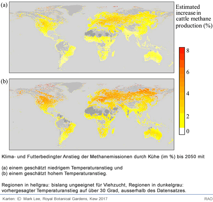 "Je nach Klimaszenario könnte der Methan-Ausstoss jeder Kuh bis 2050 um bis zu 4,5 Prozent ansteigen. Wenn man jetzt noch bedenkt, dass die Viehbestände drastisch steigen werden, könnte Vieh im Jahr 2050 Methan in einer -Menge emittieren, die dem Erwärmungspotential von 4,7 Giga Tonnen Kohlendioxid entspricht. Das wäre ein über 70 Prozent höherer Wert als zum gegenwärtigen Zeitpunkt. Verantwortlich ist der sinkende Nährwert der Futterpflanzen", fasst Dr. Peter Manning, Wissenschaftler am Senckenberg Biodiversität und Klima Forschungszentrum in Frankfurt, die Ergebnisse zusammen.