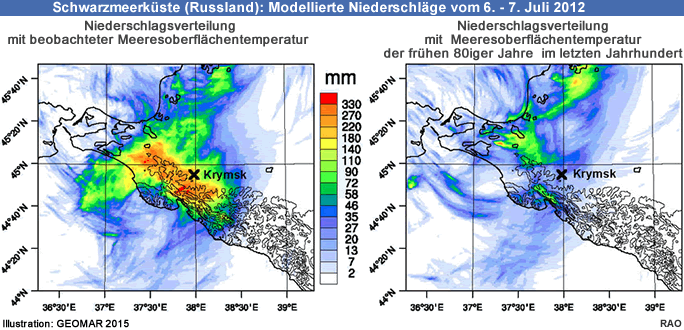 Ende Juni 2015 gab es in der Olympiastadt Sotschi, nicht weit von Krymsk ebenfalls am Schwarzen Meer gelegen, ausserordentlich heftige Niederschläge. Dieses Ereignis, bei dem 175 Liter Regen pro Quadratmeter innerhalb von 12 Stunden gemessen wurden,zeigt, wie relevant die Arbeit der Kieler Meeresforscher ist. "Über dem gesamten östlichen Mittelmeer und Schwarzen Meer ist die Atmosphäre durch die Meereserwärmung deutlich instabiler geworden. Wir rechnen deshalb damit, dass Ereignisse wie in Krymsk oder Sotschi in Zukunft häufiger auftreten.", so der Kieler Klimaforscher.