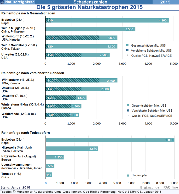 Die Schäden aus Naturkatastrophen sind 2015 erneut niedriger ausgefallen als im Vorjahr. Das natürliche Klimaphänomen El Niño dämpfte die Hurrikanaktivität im Nordatlantik, während sich in vielen Entwicklungs- und Schwellenländern starke Überschwemmungen und Hitzewellen ereigneten. Die tödlichste und teuerste Katastrophe gemessen an den Gesamtschäden war das Erdbeben in Nepal im April 2015. Rund 9'000 Menschen kamen ums Leben, der Gesamtschaden betrug 4,8 Mrd. US$.