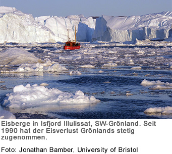 Die Gletscher auf Grönland schmelzen. Nach Berechnungen britischer Eisforscher hat sich die in den Nordatlantik abfliessende Wassermenge seit 1990 um etwa 50 Prozent erhöht. Aufgrund der verstärkten sommerlichen Eisschmelze und mit von Gletschern abgebrochenen Eisbergen sind seitdem mehr als 5'000 Kubikkilometer Wasser zusätzlich ins Meer geflossen.